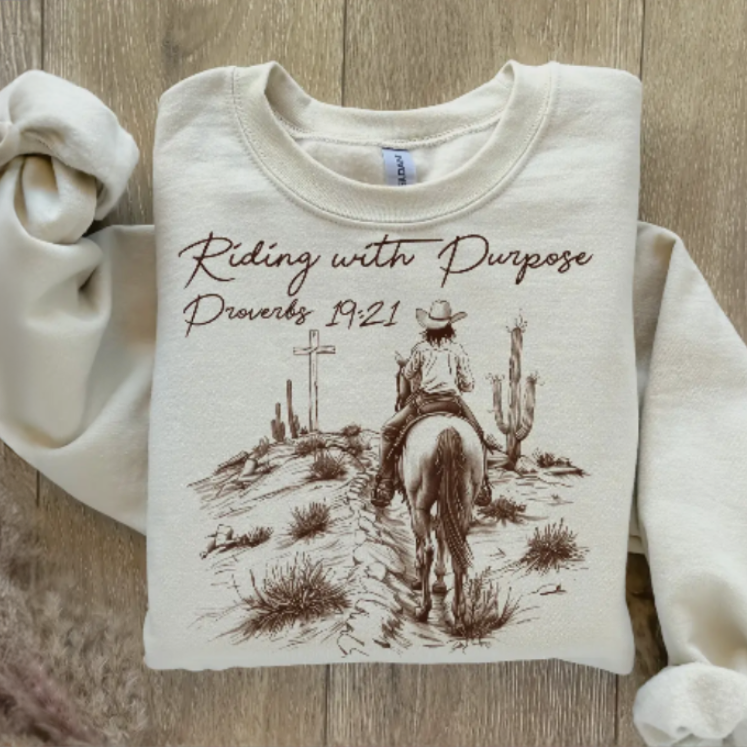 Cozy up in faith and western charm with our Riding with Purpose sweatshirt. Featuring a beautiful hand-drawn design, this piece is a gentle reminder of Proverbs 19:21 — that God’s purpose always prevails.